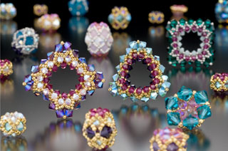 Crystal Elements include directions for a variety of balls, rondelles, triangles, squares, flowers, medallions and more! Receive a bonus instruction card for stitching rivolis in the triangle and square shapes. Seventeen full color photographed pages are in the instruction booklet. A follow up e-mail adds 2 pages to the instructions for larger sizes of triangles and squares.