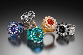 Crystal Oval Ring features a 18 x 13 mm fancy European Crystal oval stone set in bicone crystals and pearls. Add a simple and elegant peyote band.